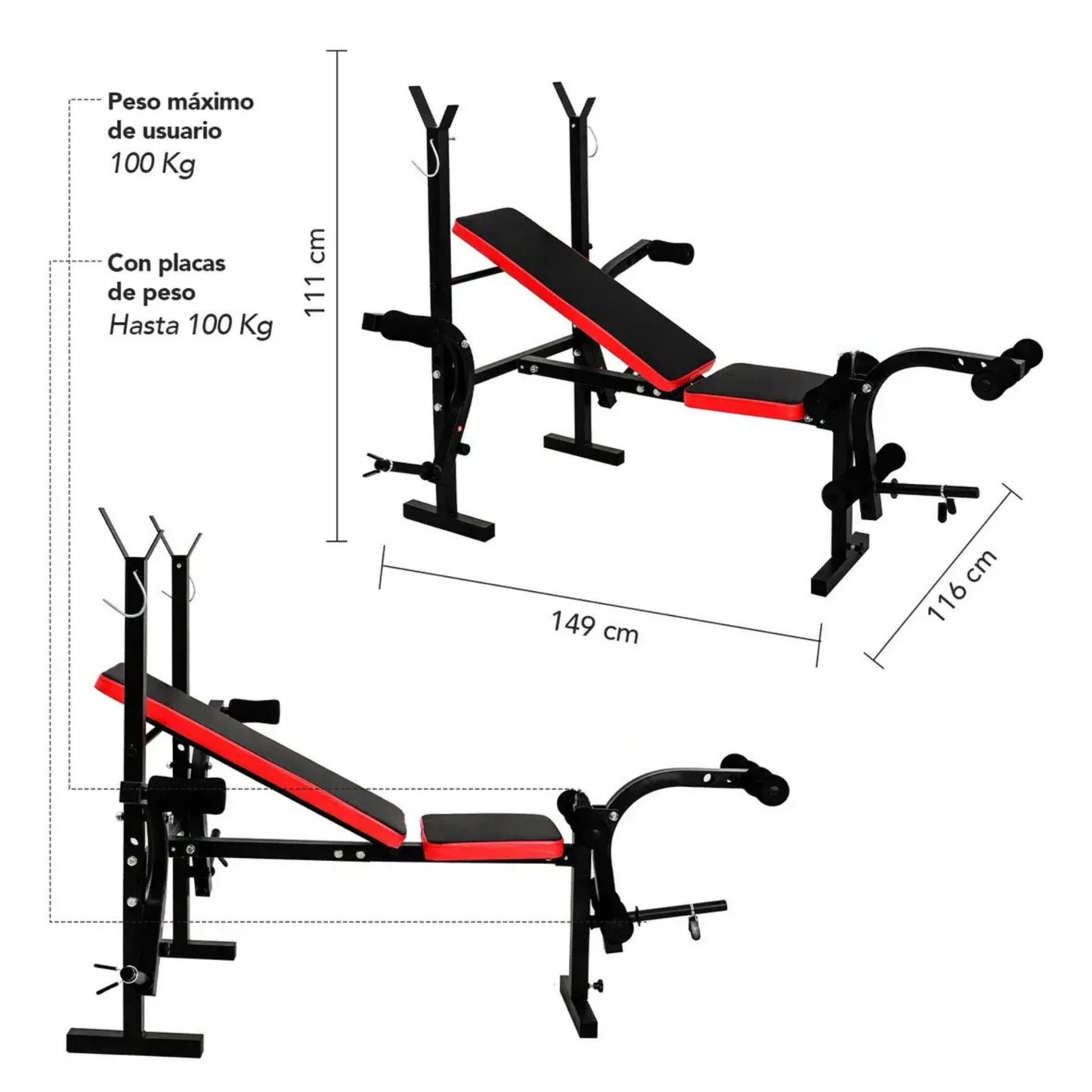 Este equipo multifuncional te permite trabajar todos los grupos musculares de forma eficiente, gracias a su barra de soporte con una altura máxima de 102 cm y una capacidad de carga de hasta 100 kg. Además, incluye un curl de mariposa y curl de pierna con una carga máxima de 50 kg cada uno, ideal para fortalecer tanto la parte superior como la inferior del cuerpo.