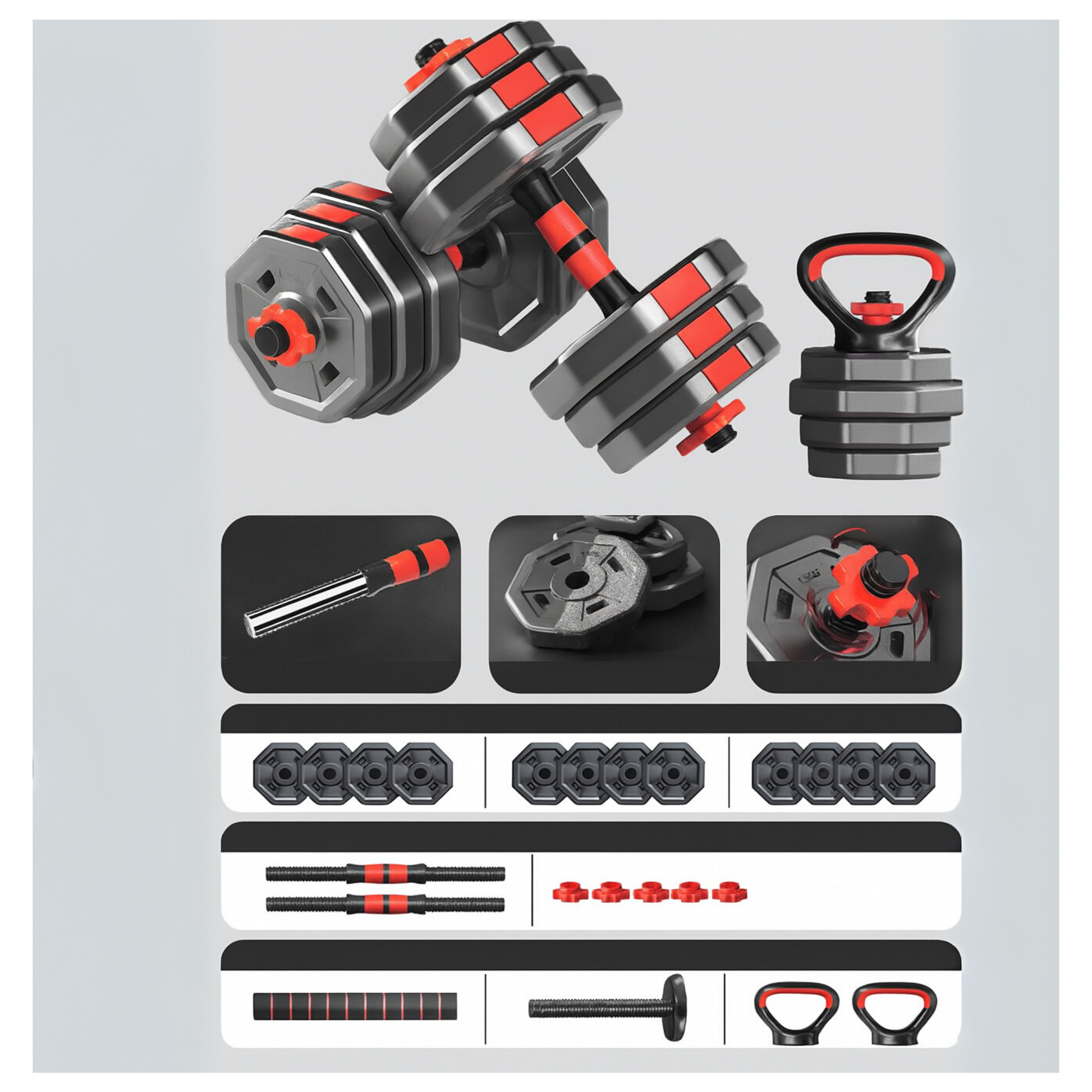 Diseño 3 en 1, Cuentas con dos barras cortas para formar mancuernas, juego de discos cementados recubiertos de capa protectora. Extensor que conecta ambas mancuernas para formar una barra larga, Dos mangos push up kettlebell y un soporte kettlebell