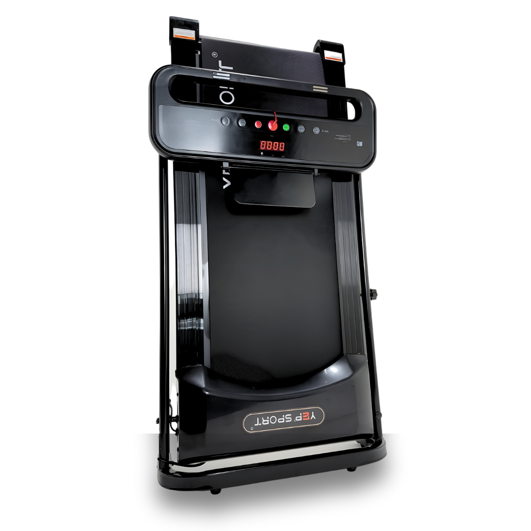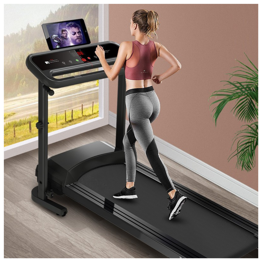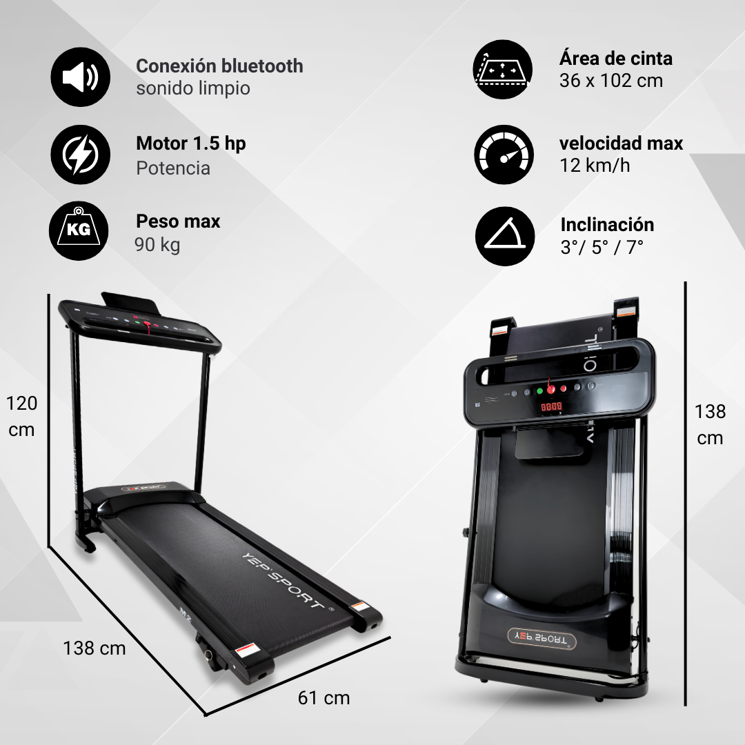 Práctica, plegable, versátil, superficie de trote optimizada. Diseñada para ejercitar en el hogar. Modelo de 1.5 HP de 0,8 a 12 km/h, con materiales extra livianos (solo pesa 26kg y se pliega para ocupar el menor espacio posible.