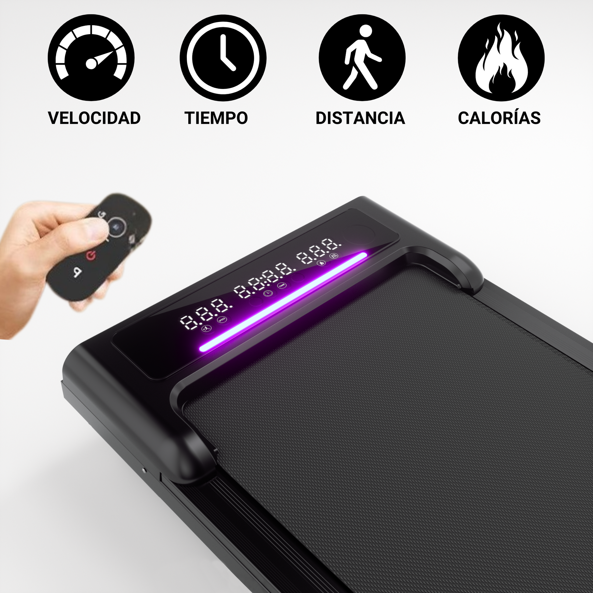 Caminadora tecnológica con Pantalla banda LED , donde puedes visualizar las calorías quemadas, el tiempo de entrenamiento, distancia recorrida, además de la velocidad, con un máximo de 10 km/h
