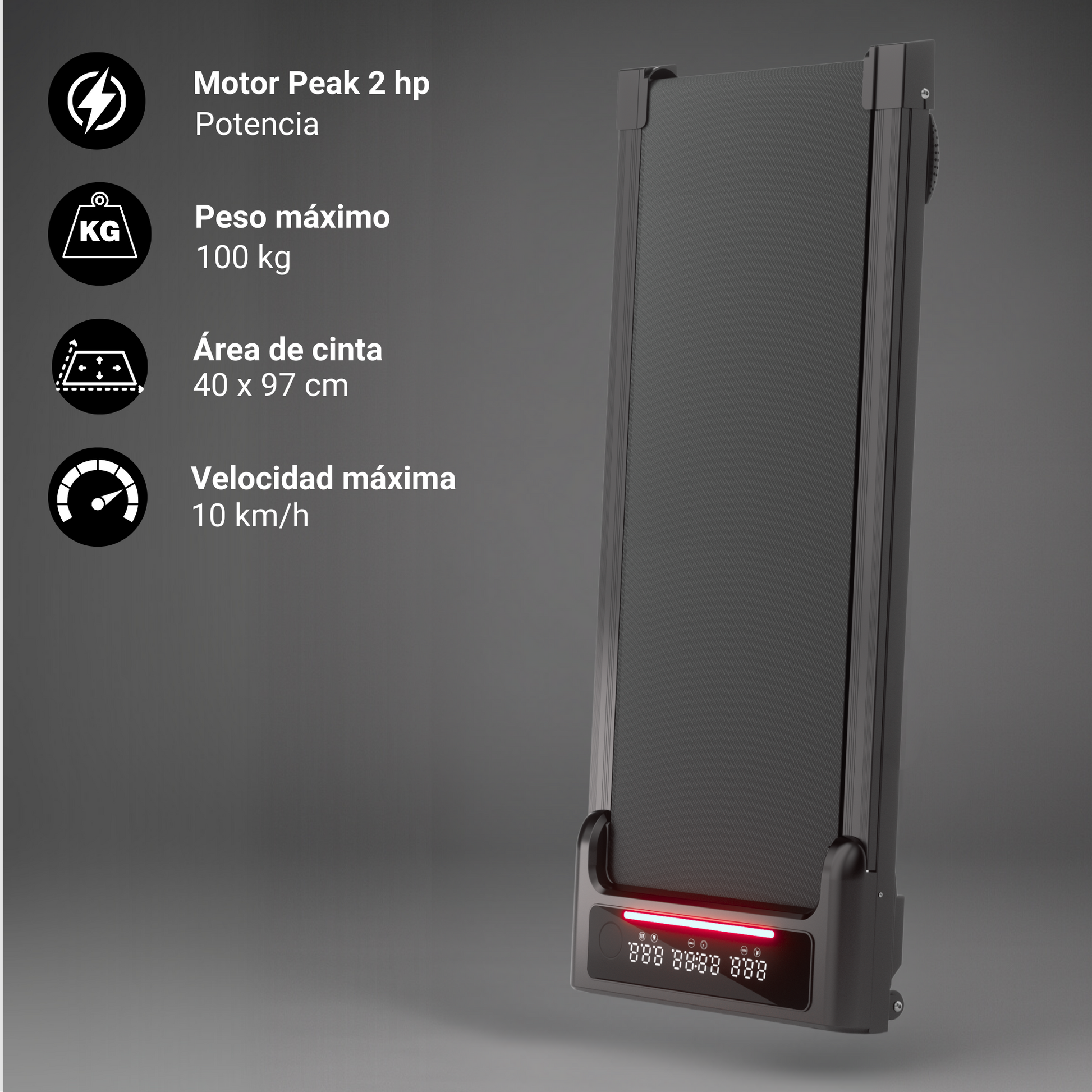 - Velocidad máxima: 10 km/h. Mientras vas elevando la velocidad, tu trotadora YEP cambiará el color del panel.