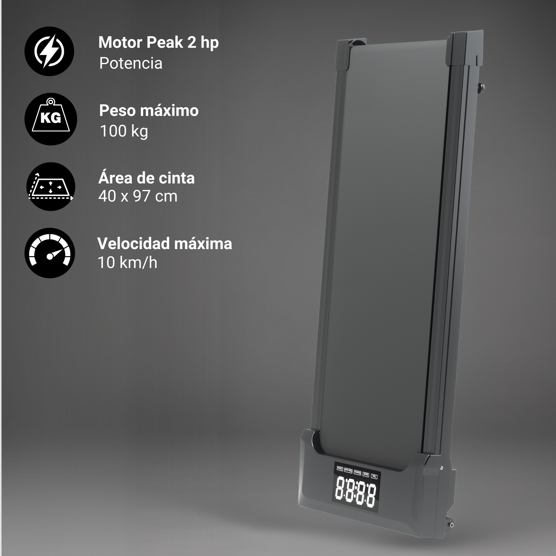 Caminadora tecnológica con Pantalla banda LED , donde puedes visualizar las calorías quemadas, el tiempo de entrenamiento, distancia recorrida, además de la velocidad, con un máximo de 10 km/h